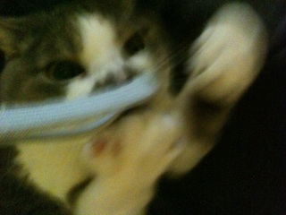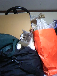 写真は、げんこつ小道具にまみれるウチの猫。