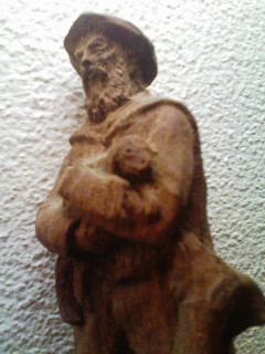 子山羊抱いた爺さんの木彫りの人形。呑気な人形。あんた誰??